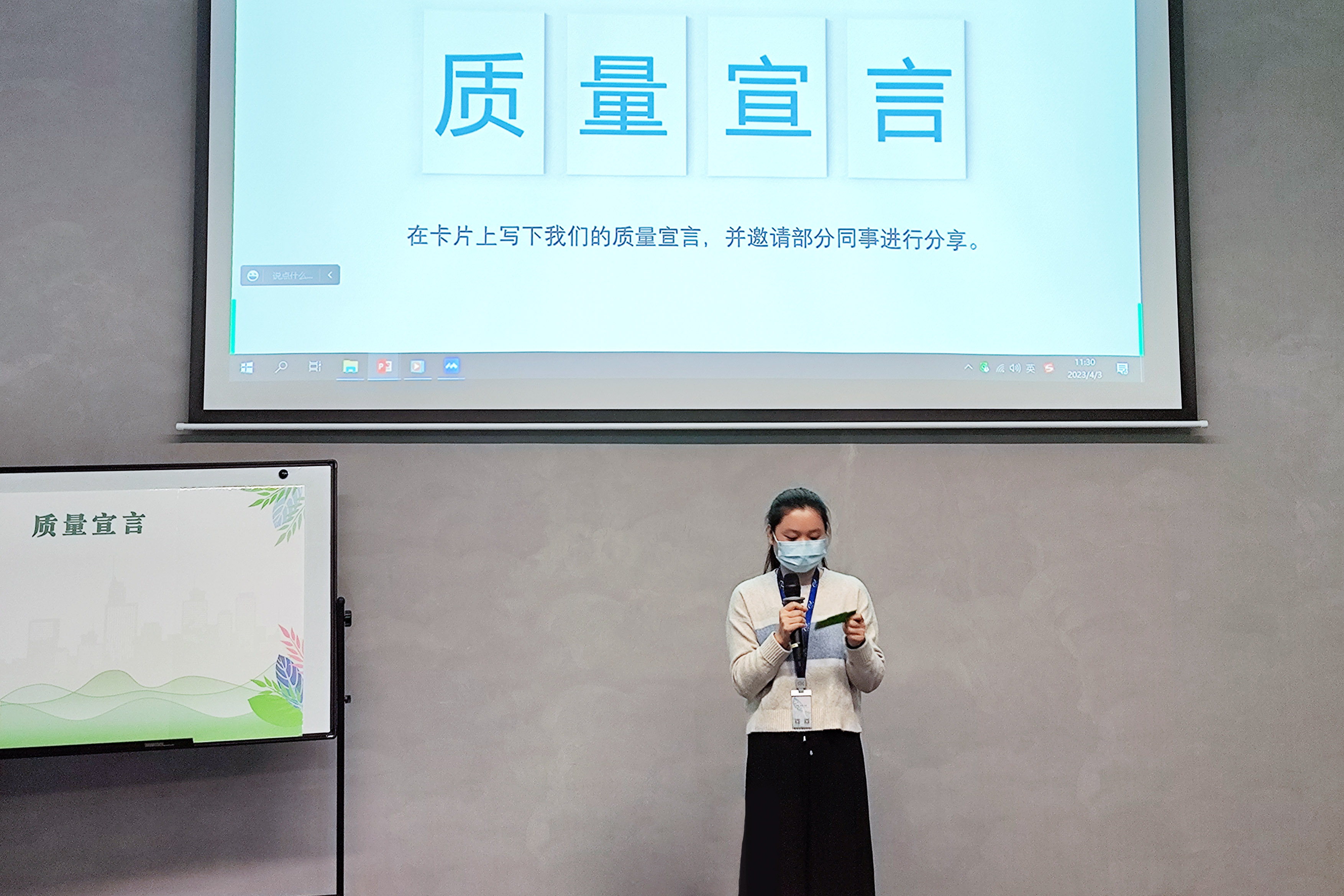 领导们的致词定下了“质量周”活动的基调,对同事们也有所启发。接下来的质量宣言分享环节,同事们踊跃参与,纷纷主动上台分享了自己的质量宣言,以及如何做到“为产品质量护航”的心得体会。可惜启动会时间有限,未能让同事们在现场一一进行分享。启动会结束前,同事们将写有自己“质量宣言”的卡片粘贴到质量宣言墙上,并在“质量树”上按下了手印,共同许下了对守护产品“质量”的愿望与承诺。